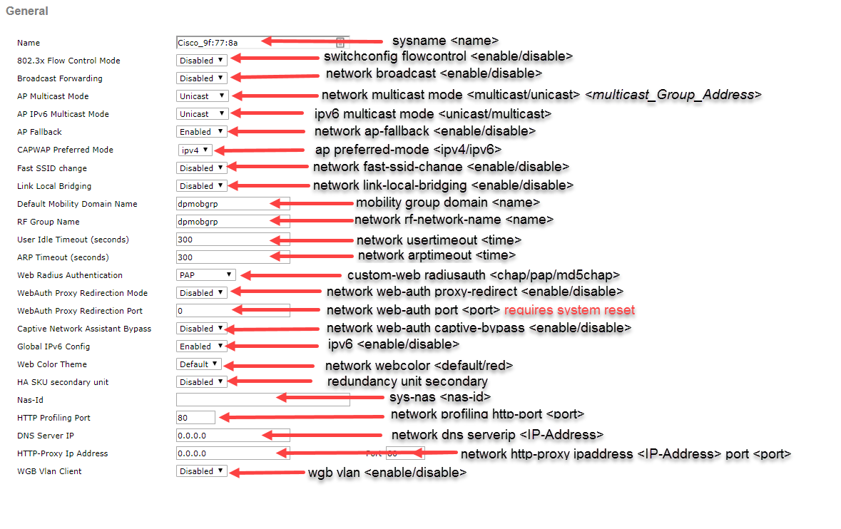 NOTE: For some of the screenshots I have modified the layout to make it easier to add the CLI commands next to the WebUI options. Also some screenshots were taken from a production WLC so I have blacked out some field values. These options/ commands screenshots and commands were from 8.5.x train of the WLC code