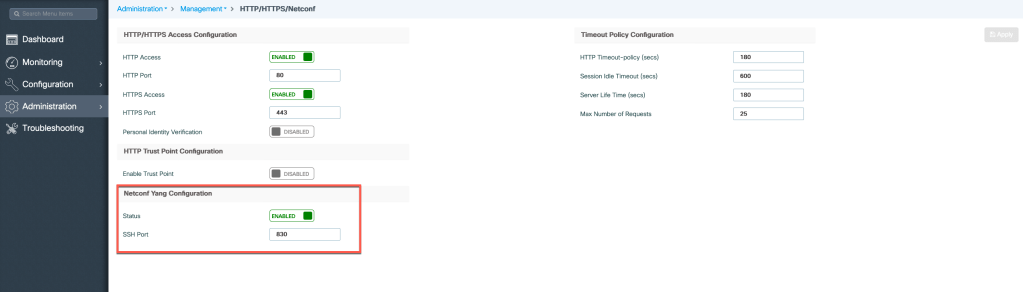 Under Netconf Yang Configuration mark it as enabled and note the port its configured to, by default its 830. I recommend not changing it unless you have to.