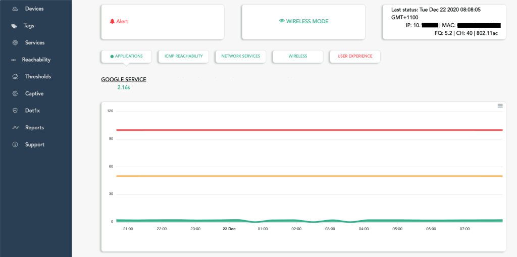 The sensor then runs the number of tests against your wireless and reports back in a nice to use dashboard showing the health of the network in a nice easy to understand traffic light system – Green Good, Orange Minor Issues and red bad.