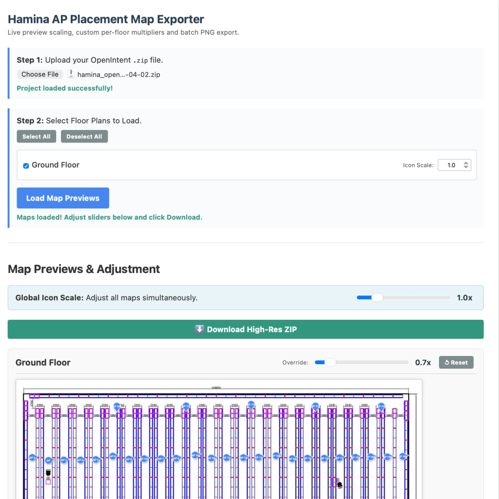 Now how was I fixing this until today. First, I opened the design in Hamina. I then enlarged the image to see the APs and numbers clearly. Then, I would take multiple screenshots and manually stitch them together. After that, I would give the stitched image to the installer. I said there has to be a better way. I turned to AI. Within a few minutes, I managed to create a website. It produces PNG images with customizable AP sized icons. Being PNG, it’s possible to be resized to allow the installers to print out in A0 if they choose.