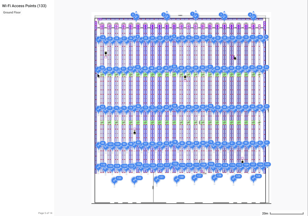 For our standard stores and carpet offices, the pre-canned Hamina PDF has been good enough to get by. Still, when we start doing large warehouses or high-density areas, the PDF AP placement sections don’t cut it. Due to the pre-canned PDF reports within Hamina utilising A4 pages and the images not adjusting the AP icons you can end up with something like this: